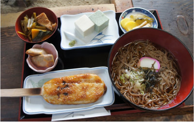 御幣餅1本・冷奴・かけ蕎麦・漬物・小鉢・デザート。(ざる蕎麦、かけうどん、ざるうどんにも変更可能です)