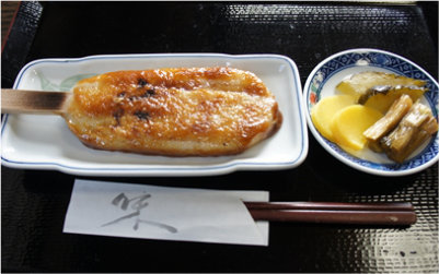阿智村独自のぞうり型御幣。店内でご飯を蒸して、1本ずつ手作りしています。くるみ・醤油・砂糖の甘辛いタレが特徴です。
